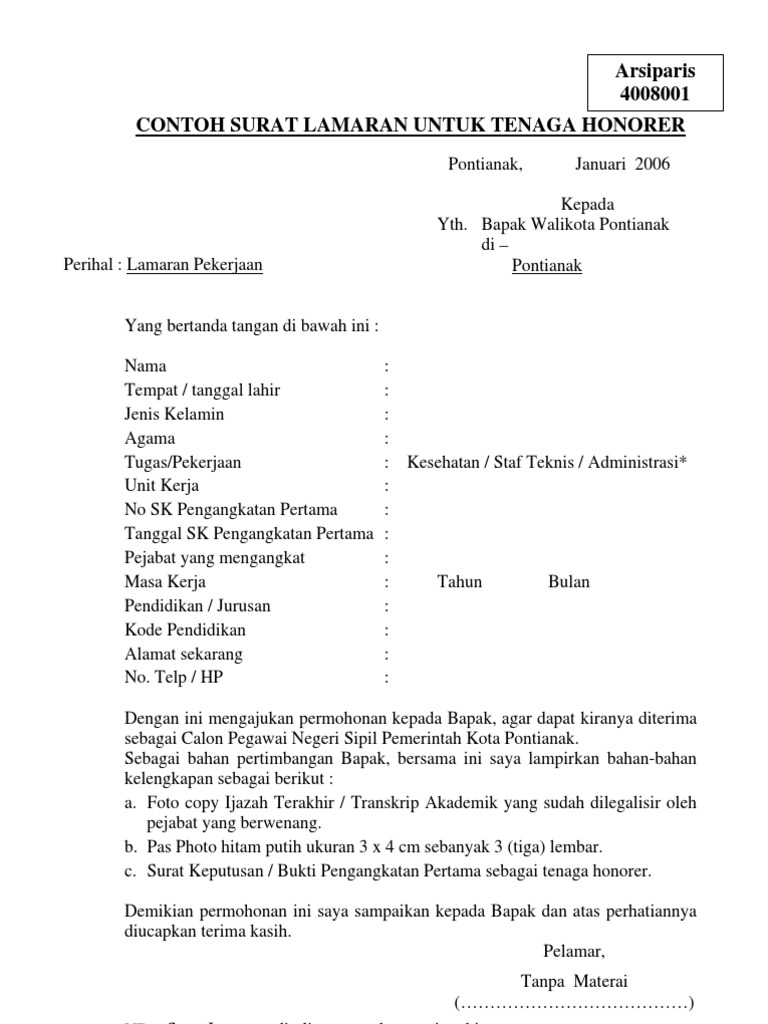 Dengan ini mengajukan lamaran pekerjaan sebagai guru honorer. Kali ini portal uang akan mencontohkan surat lamaran kerja guru honorer yang dibagi berdasarkan informasi lowongan kerja yang didapat. Telah kami sediakan beberapa contoh surat lamaran kerja sebagai honorer pemerintah daerah (pemda) dalam bentuk file doc yang anda sudah berada diartikel yang tepat, karena disini kami akan memberikan beberapa contoh surat lamaran kerja tenaga honorer di instansi pemerintahan daerah. Home » surat keterangan » contoh surat pengalaman kerja guru yang baik dan benar. Panduan cara membuat surat lamaran kerja surat lamaran kerja ini tentu akan sangat dibutuhkan bagi anda yang akan melamar pekerjaan. Contoh surat lamaran kerja guru honorer. Contoh surat lamaran kerja guru honorer. Oleh karena itu pada kesempatan kali ini saya bermaksud untuk mencoba memberikan sebuah contoh surat lamaran pekerjaan yang ditujukan untuk melamar guru tk. S1 sistem informasi bermaksud untuk mengajukan lamaran sebagai staff it honorer pada dinas yang bapak/ibu hormat saya, sumanto efendi demikian info dari saya kali ini untuk contoh surat lamaran kerja pegawai honorer kantor pemerintahan, semoga. Home » contoh lamaran pekerjaan guru » contoh surat lamaran kerja guru honorer. Kepala sma negeri 1 surabaya di surabaya dengan hormat, berdasar informasi yang dimuat dalam website resmi sma negeri 1 surabaya terkait penerimaan tenaga pendidik honorer tahun 2015, maka saya yang bertanda. Perhatikan beberapa contoh surat lamaran kerja guru agar kamu bisa membuat surat lamaran kerja terbaik sendiri. Contoh kedua surat lamaran kerja guru smk.