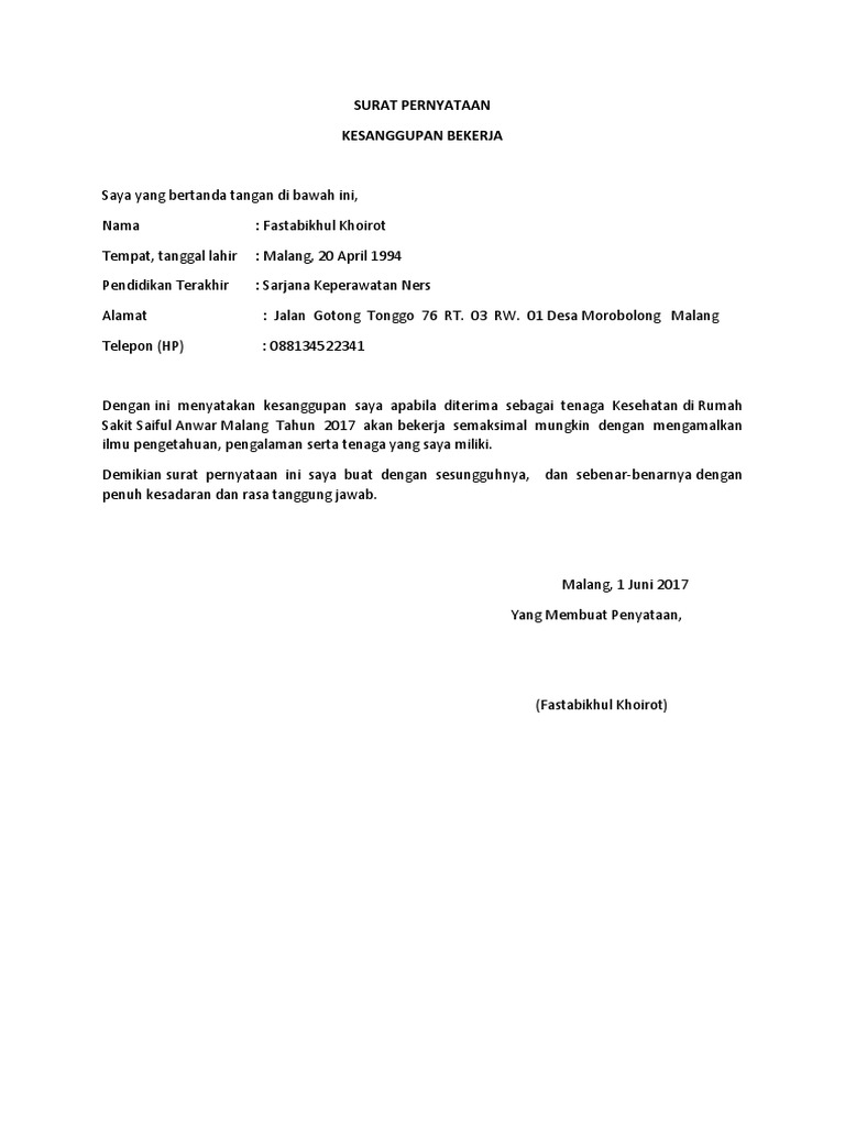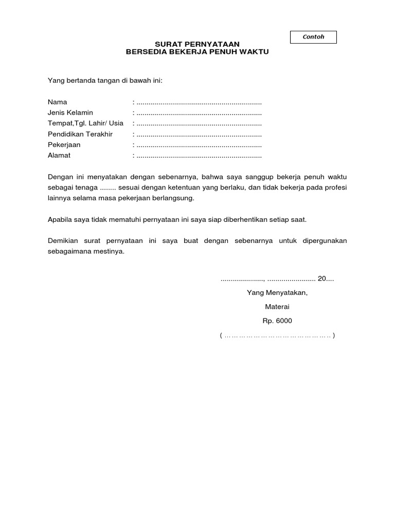 Contoh surat pernyataan di atas harus ditulis ulang menggunakan komputer, ditempel materai seharga rp6000 dan dibubuhi tanda tangan sesuai prosedur saat membuat surat pernyataan salah satu tujuannya adalah untuk menyatakan kesanggupan kita melakukan suatu jenis pekerjaan tertentu. Contoh surat pernyataan kerja siap ditempatkan dimana saja adalah sebagai berikut Berganti shift kerja kapan saja jika dibutuhkan. Namun untuk kasus tertentu, adakalanya harus menggunakan pernyataan tertulis. Saya yang bertanda tangan di bawah ini